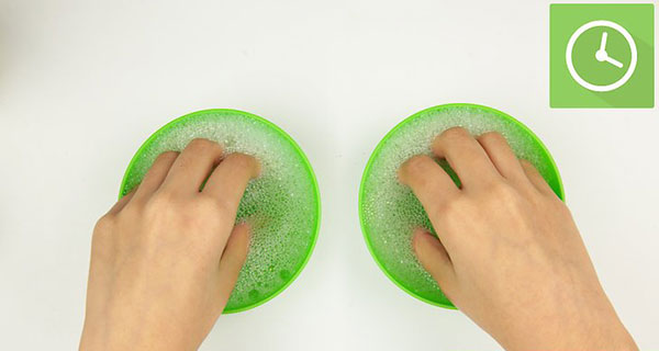 ۲. در ظرفی که دستهایتان در آن جا شود یا در دو ظرف جداگانه آب ولرم به همراه نرم کننده بریزید. دستهایتان را در آنها گذاشته و به مدت ۵ دقیقه صبر کنید. میتوانید این کار را یکی یکی انجام دهید.