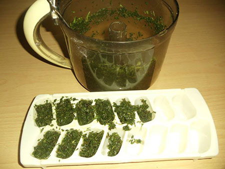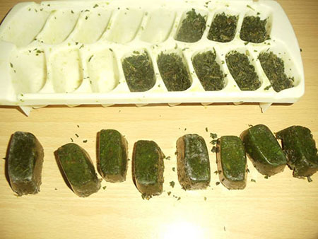 اول سبزی مورد نظر را خریده و پاک کرده و میشوییم و خرد میکنیم بعد در قالب یخ میریزیم و حسابی فشرده میکنیم.