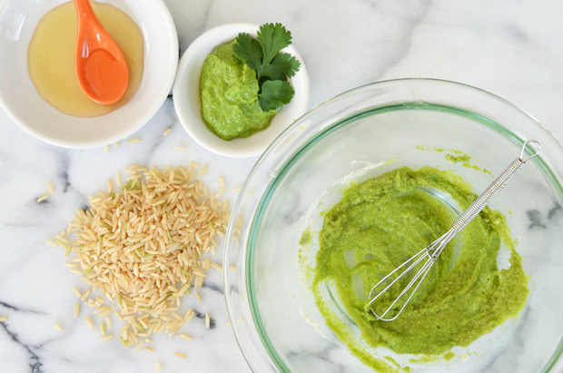گشنیز، روغن نارگیل و آب لیمو را در غذا ساز یا مخلوط کن بریزید تا صاف و یکدست شوند سپس نمک را به این ترکیب اضافه کنید و در کاسهای با هم مخلوط کنید.
