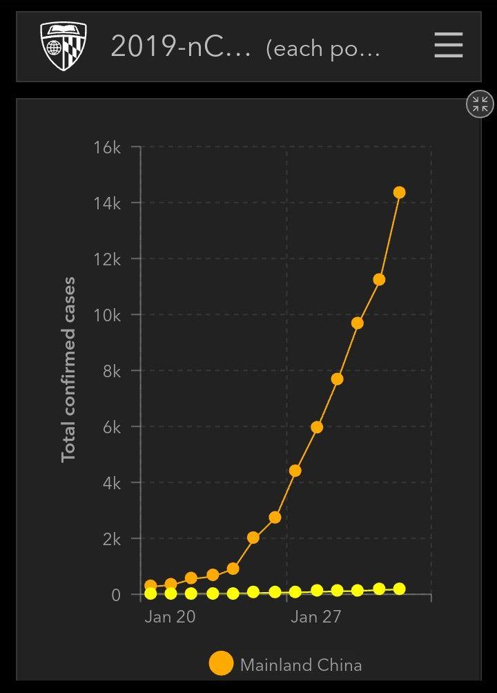همانطور که در تصویر ذیل مشاهده میشود، نمودار رشد نمائی دارد، بدین معنا که تقریبا طی کمتر از ۵ روز تعداد مبتلایان از ۶٠٠٠ نفر به ١٢٠٠٠ نفر رسیده اند. (نقاط نارنجی مبتلایان در چین، و نقاط زرد مبتلایان در سایر نقاط است.)