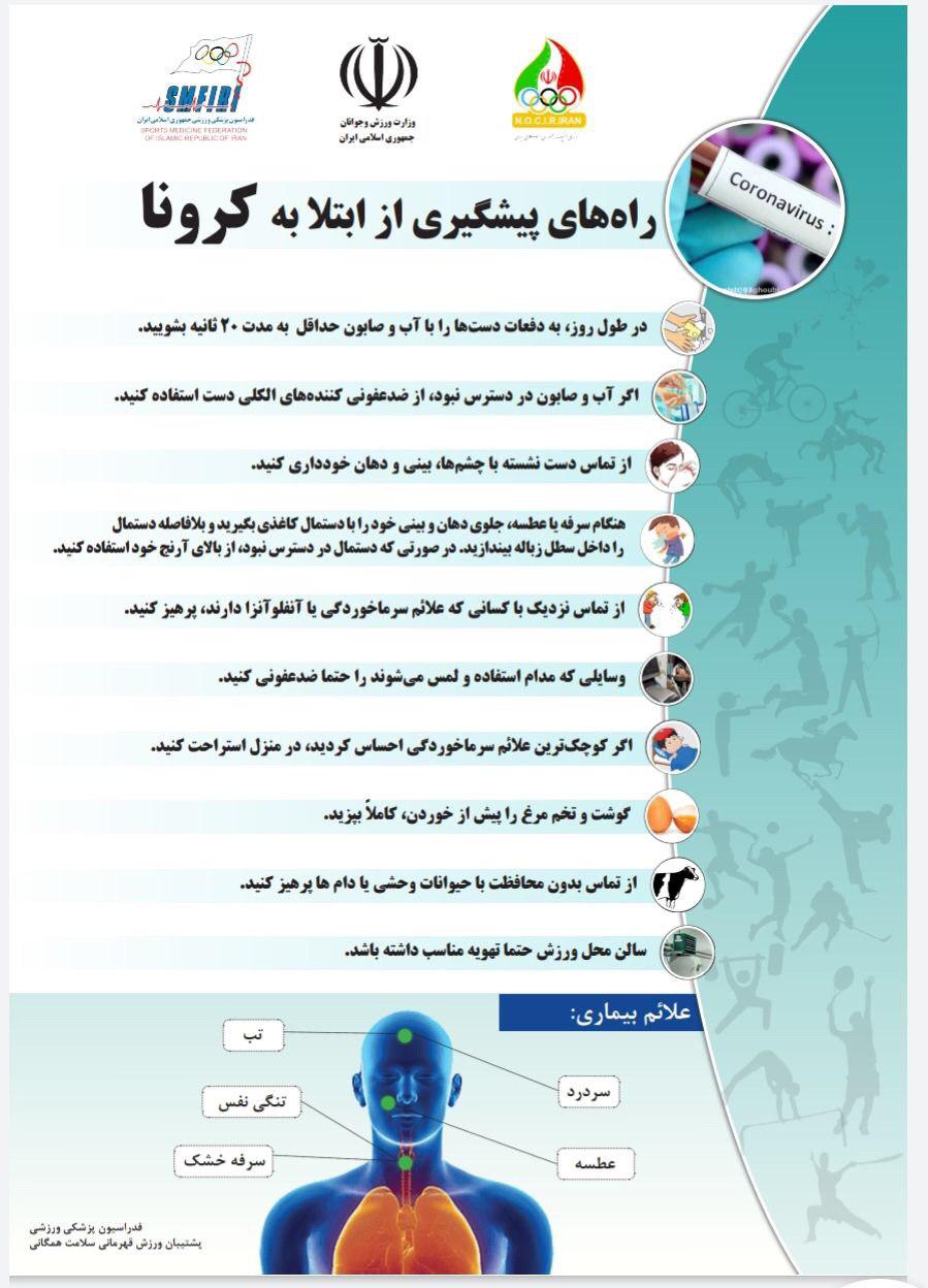 توصیههای فدراسیون پزشکی ورزشی در پیشگیری از ابتلا به کرونا را در این اینفوگرافی ببینید.