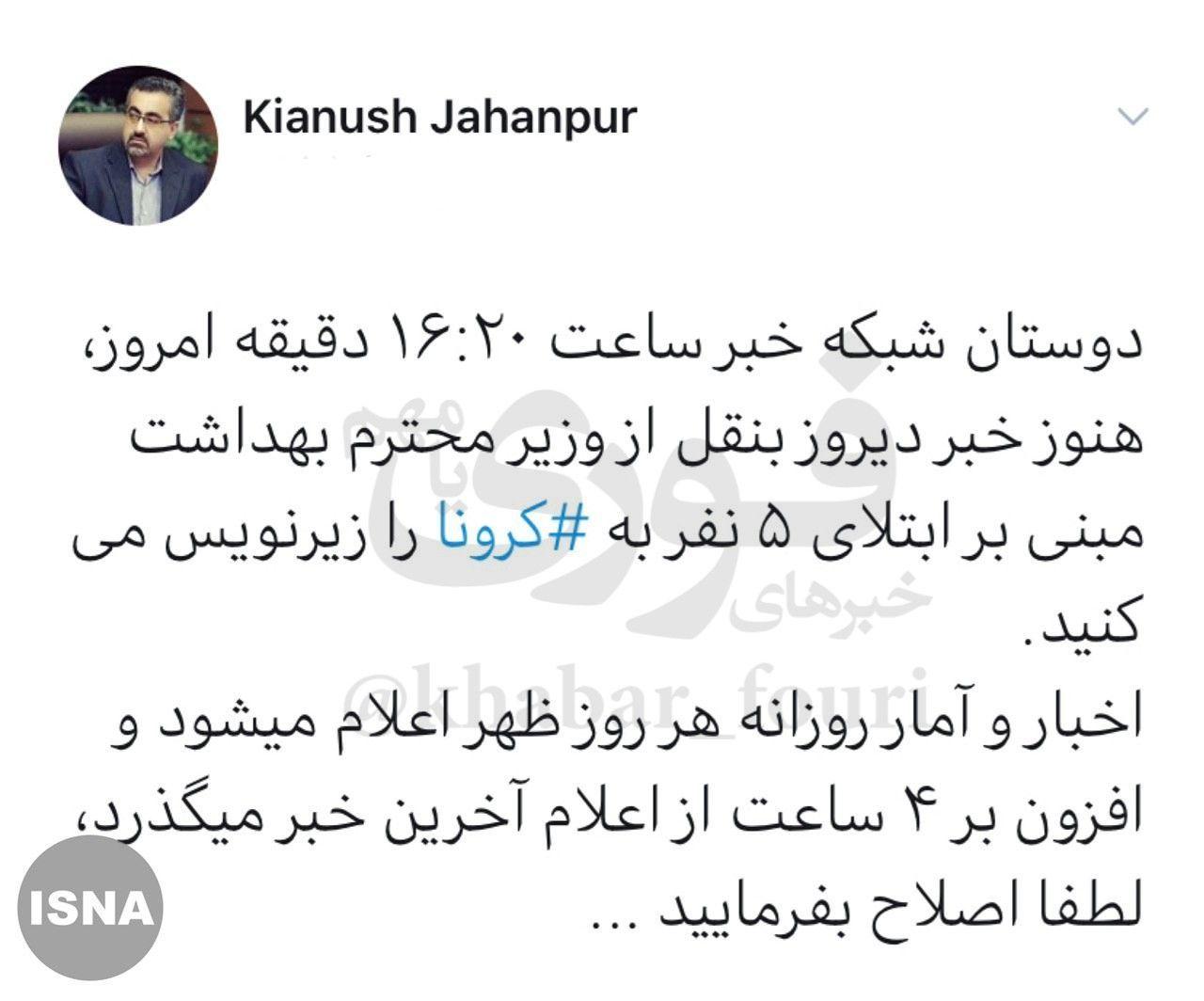 مدیرکل روابط عمومی وزارت بهداشت گفت: دوستان شبکه خبر ساعت ۱۶:۲۰ دقیقه امروز، هنوز خبر دیروز به نقل از وزیر محترم بهداشت مبنی بر ابتلای ۵ نفر به کرونا را زیرنویس میکنید.