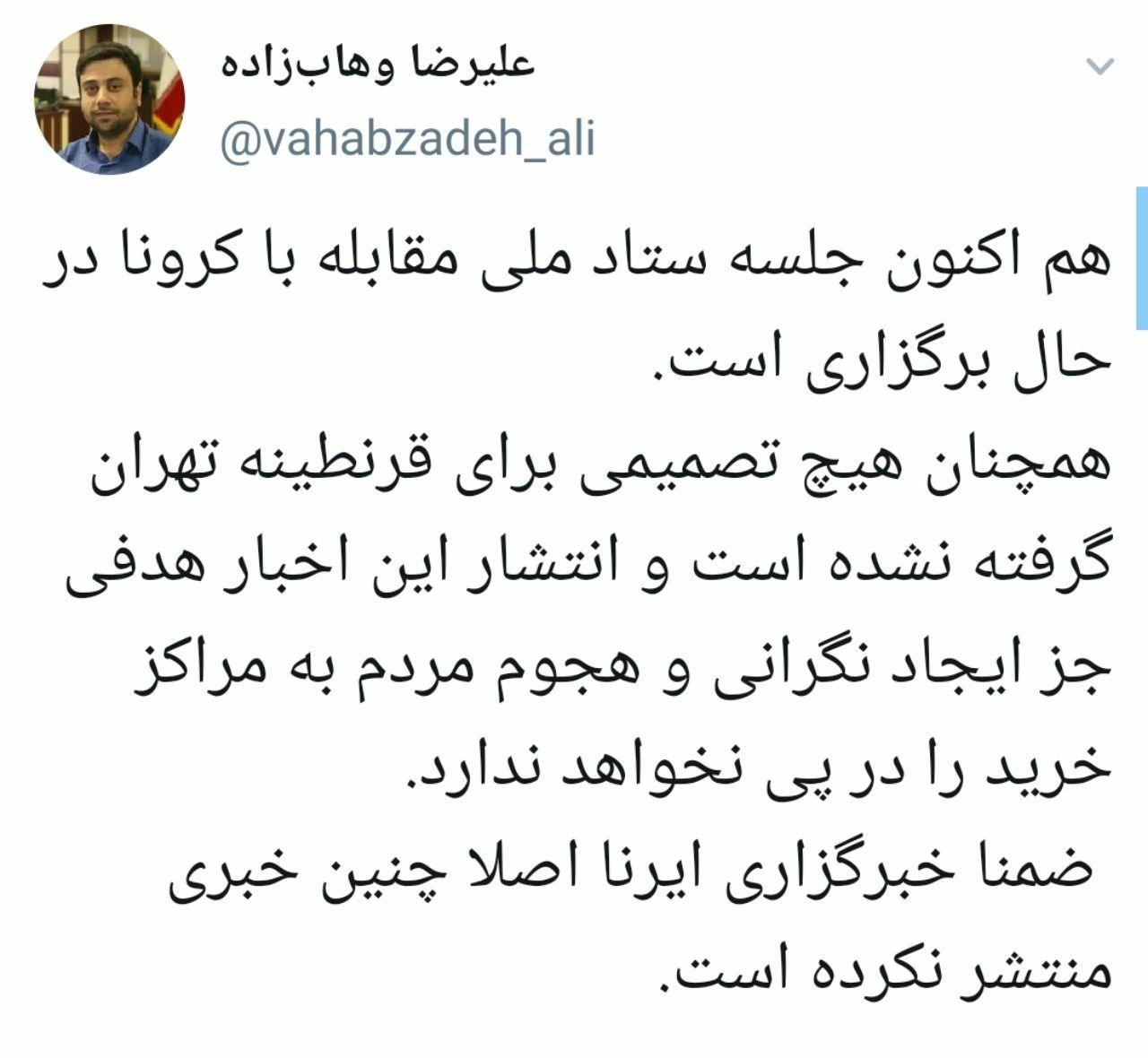 همچنین اخبار ضد و نقیض درباره قرنطینه استان تهران اعلام شده است.( در اینجا بخوانید)