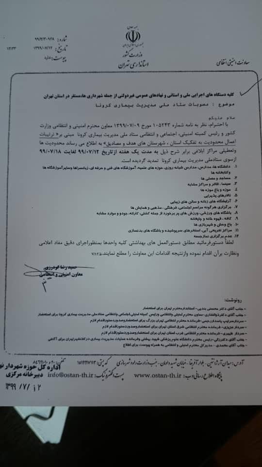با اعلام استانداری تهران از تاریخ ۱۲ مهر تا ۱۸ مهر فعالیت برخی مراکز در استان تهران ممنوع است.