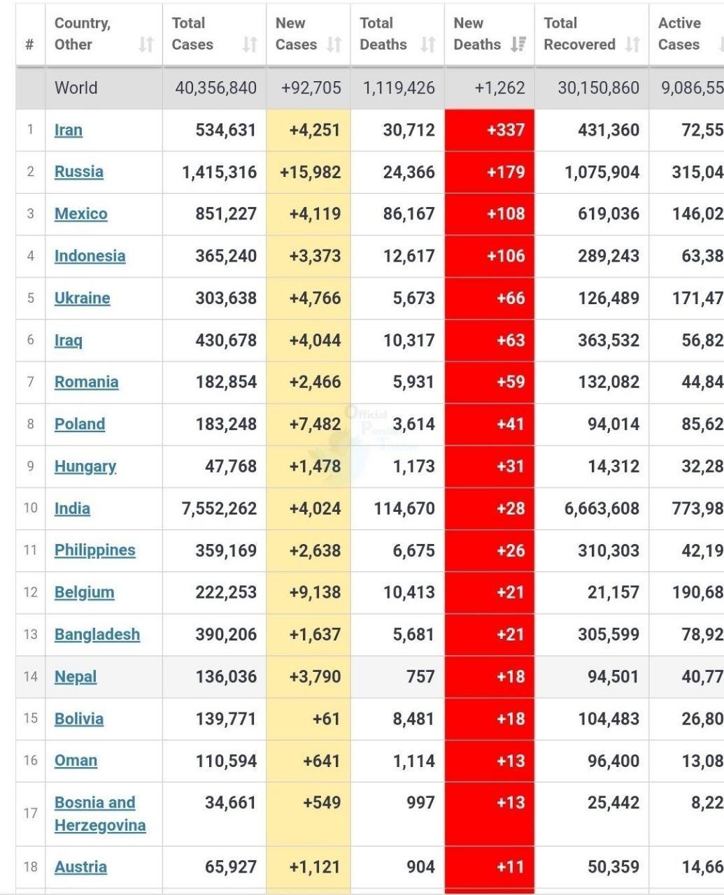 در لیست بالا گشور آمریکا وجود ندارد از طرفی اگر بخواهیم نسبت به چعیت کشورها مقایسه کنیم مثلا کشور هندوستان بالای یک میلیارد جمعیت دارد یا اندونزی و....کشور ما80 میلیون جمعیت دارد انوقت ما بالای 300 نفر کشته یا فوتی داشته ایم اگر بخواهیم وضعمان را ببینیم ما اوضاع مان خیلی خراب است خراب ...است چرا؟؟ متاسفانه در کشور کنترلی از لحاظ تجزیه وتحلیل بر روی فوتی ها و یا کسانیکه دچار این بیماری شده اند وجود ندارد چرا !! ما همه چیز را از خارجیها باید بشنویم سوالاتی که می توان کرد منظورم در ایران است 1: گروه خونی افراد فوتی در ایران کدام گروه خونی بیشتر در معرض خطرند ؟ 2: کدام گ روه از بیماریهای زمینه ای دچار این بیماری شده اند منظوم ایران است ؟ 3 : سن این افراد ایا مسن بوده اند یا جوان ویا ... 4: کدام یک از مناطق با چه درجه ای از تغییرات اب و هوایی 5: افراد چاق یا لاغر ؟ و سوالات دیگر چرا باید یک خبرگزاری خارجی این اطلاعات را بما بدهند ؟؟
