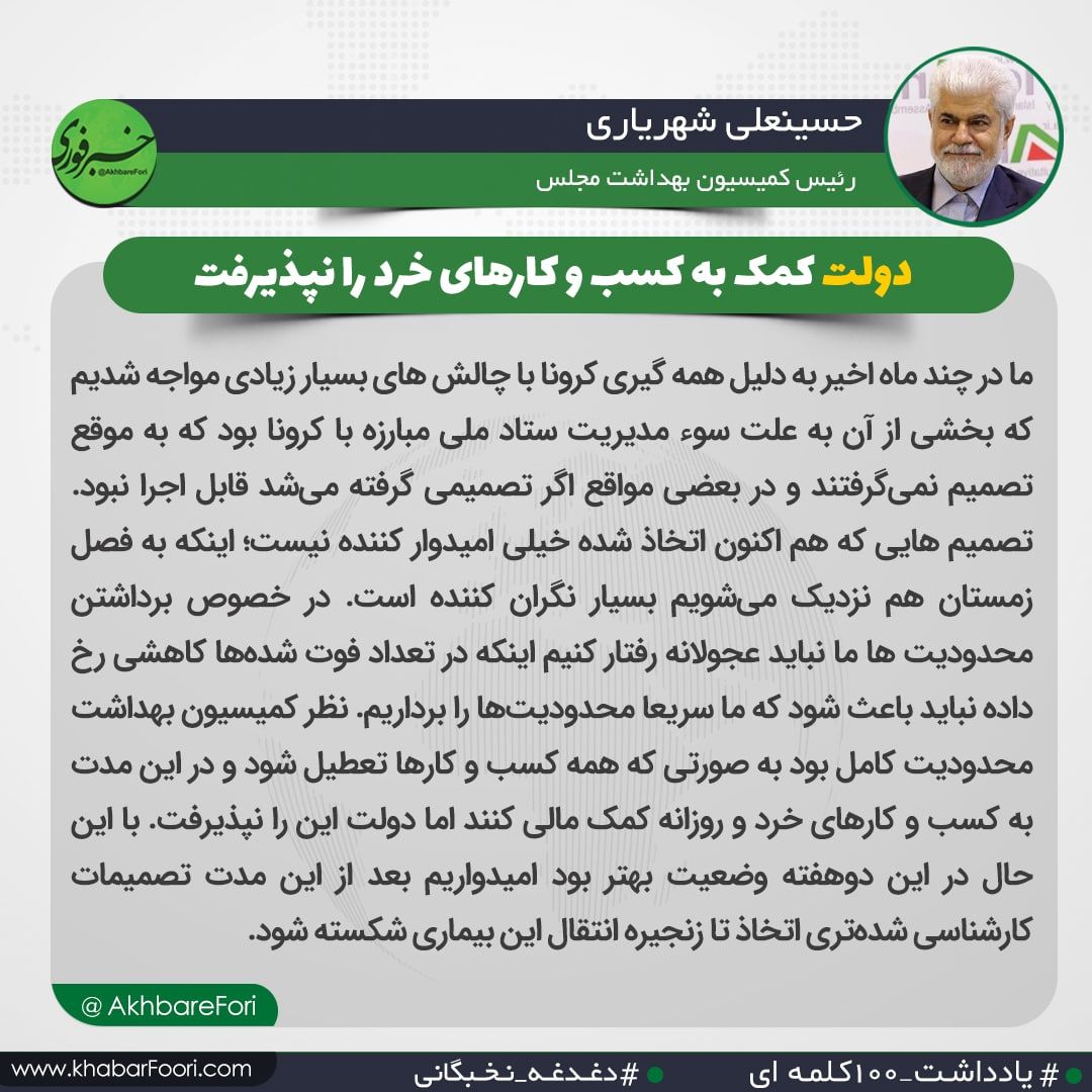 حسینعلی شهریاری، در یادداشتی نوشت: ما در چند ماه اخیر به دلیل همه گیری کرونا با چالش های بسیار زیادی مواجه شدیم که بخشی از آن به علت سوء مدیریت ستاد ملی مبارزه با کرونا بود که به موقع تصمیم نمیگرفتند.