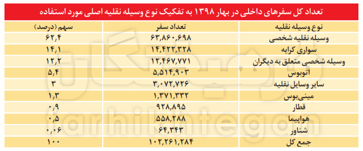 براساس گزارش گردشگران ملی مرکز آمار ایران، در بهار سال 1398 از تعداد 102 میلیون و 261 هزار سفر انجام شده در کشور، 62.64درصد آن مربوط به وسیله نقلیه شخصی، 37.6درصد آن مربوط به حملونقل عمومی اعم از سواری کرایه، اتوبوس، مینیبوس، قطار، هواپیما و همچنین وسلیه نقلیه متعلق به دیگران انجام شده است. براین اساس اتمام زودهنگام بلیتهای وسایل حملونقل عمومی نمیتواند موضوع بیاهمیتی باشد. اما نکتهای که در اینجا باید به آن توجه داشت این است که با نگاهی به سهم تاکسیهای کرایه و سایر وسایل نقلیه غیر از اتوبوس، قطار و هواپیما نشان میدهد هنوز هم جای امیدواری برای جلوگیری از حجم انبوه مسافرتها وجود دارد و باید سیاستگذار در این مقطع اقدامات و تصمیمهای لازم را اتخاذ کند.