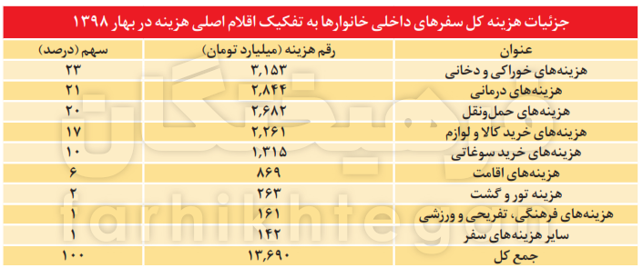 طبق گزارش «گردشگران ملی» مرکز آمار ایران در بهار سال 98 مجموع هزینه سفرهای داخلی خانوارها در ایران حدود 13 هزار و 690 میلیارد تومان بوده است. براساس این گزارش، از مجموع هزینههای خانوارها در سفرهای داخلی بهار 98 حدود 23درصد آن مربوط به خوراکی و دخانی، 21 درصد مربوط به هزینههای درمانی، 20 درصد برای هزینههای حملونقل، 17 درصد برای هزینههای خرید کالا و لوازم، 10 درصد صرف هزینههای خرید سوغاتی، 6درصد مربوط به هزینههای اقامت، 2 درصد مربوط به هزینه تور و گشت و هزینههای فرهنگی، تفریحی و ورزشی و سایر هزینهها نیز هرکدام یک درصد بودهاند. با توجه به اینکه آخرین گزارش مرکز آمار ایران مربوط به بهار 98 است و در بهار 99 نیز با ممنوعیت سفرها، درآمدهای بخشهای مختلف از سفر بهشدت کاهش یافت، بهطور دقیق نمیتوان از ضرر بخشهای مختلف از پیامدهای کرونا و کاهش سفرهای نوروزی سخن گفت.