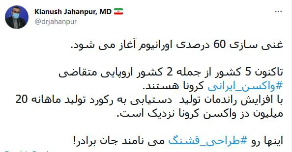 کیانوش جهانپور در توئیتی نوشت: غنی سازی ۶۰ درصدی اورانیوم آغاز می شود. تاکنون پنج کشور از جمله دو کشور اروپایی متقاضی واکسن ایرانی کرونا هستند. با افزایش راندمان تولید، دستیابی به رکورد تولید ماهانه ۲۰ میلیون دز واکسن کرونا نزدیک است.