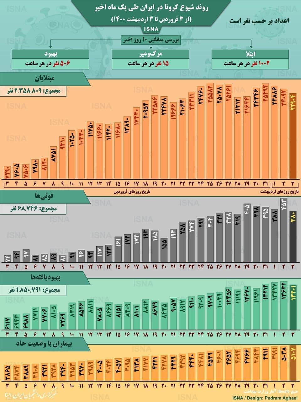 روند کرونا در ایران، از ۳ فروردین تا ۳ اردیبهشت ۱۴۰۰/ اینفوگرافی
