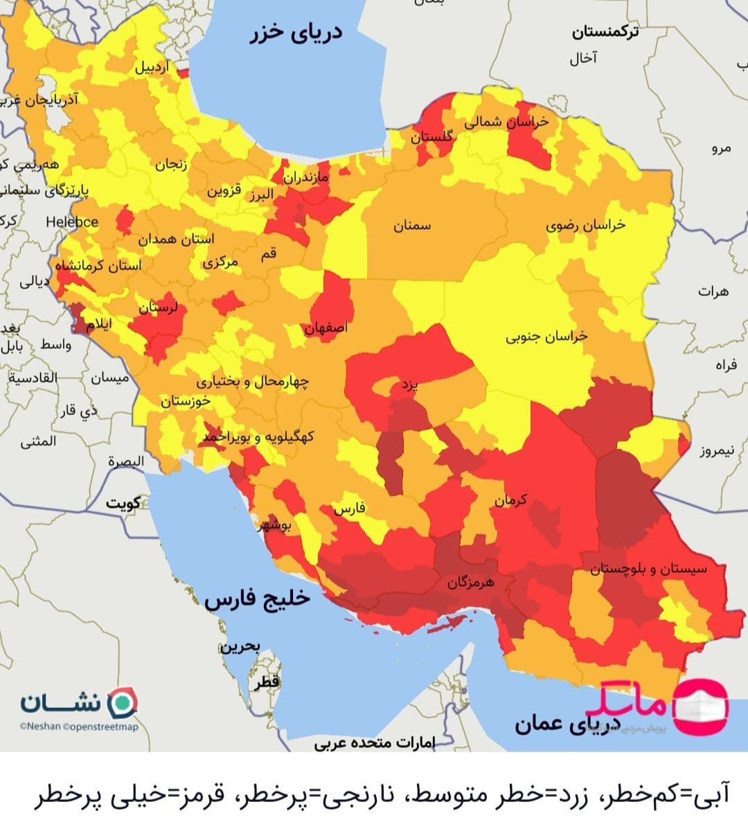 رنگبندی شهرستانها که از شنبه ۱۲ تیر ۱۴۰۰ اعمال میشود در اپلیکیشن ماسک منتشر شد. شیوع سویههای جدید ویروس و کاهش سطح مراقبتهای بهداشتی باعث آغاز خیز پنجم کرونا در کشور شده است.