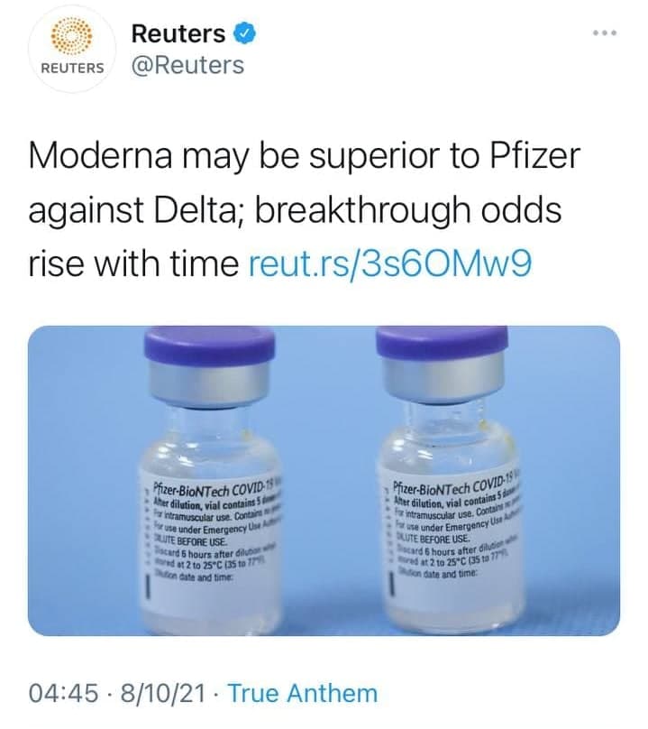 به گزارش رویترز، احتمالا مدرنا در برابر واریانت دلتا از فایزر بهتر عمل کند؛ با گذر زمان پیشرفتها افزایش خواهد یافت.