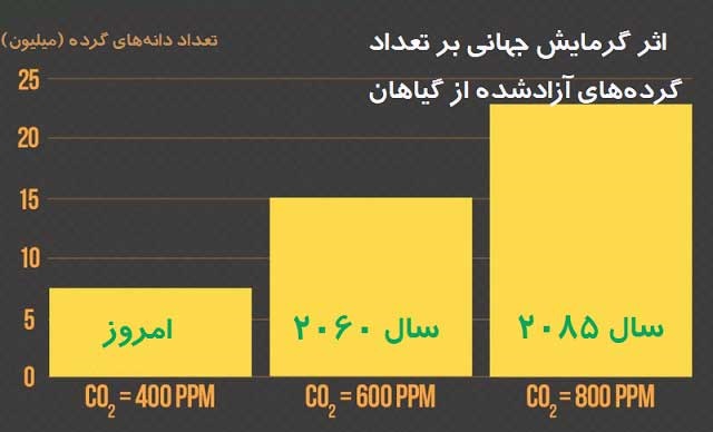 یافتههای پژوهشگران نشان میدهد که افزایش میزان کربندیاکسید، محرکی است که گیاهان با تولید بیشتر گرده به آن پاسخ میدهند و این موضوع در مناطق آلودهتر مانند اطراف شهرهای بزرگ و بزرگراهها بیشتر اتفاق میافتد. همچنین با کوتاه شدن زمستانها و طولانیتر شدن فصل گرما، گیاهان مدتزمان بیشتری را برای گردهافشانی در اختیار خواهند داشت.