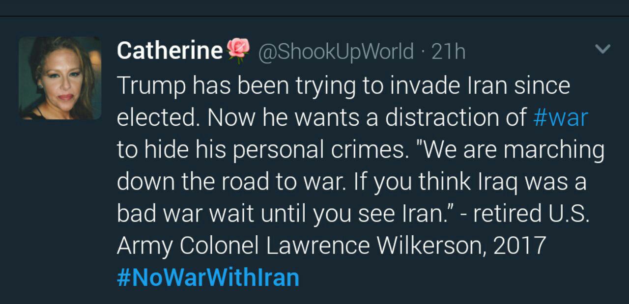 کاربری دیگر با نام کاترین قسمتی از اظهارات سال 2017 لورنس ویلکرسون(فرمانده ارشد ارتش آمریکا) را توییت کرد که در آن میگوید: " اگر شما گمان میکنید که جنگ با عراق بد و مخرب بوده است پس صبر کنید تا جنگ با ایران را ببینید."