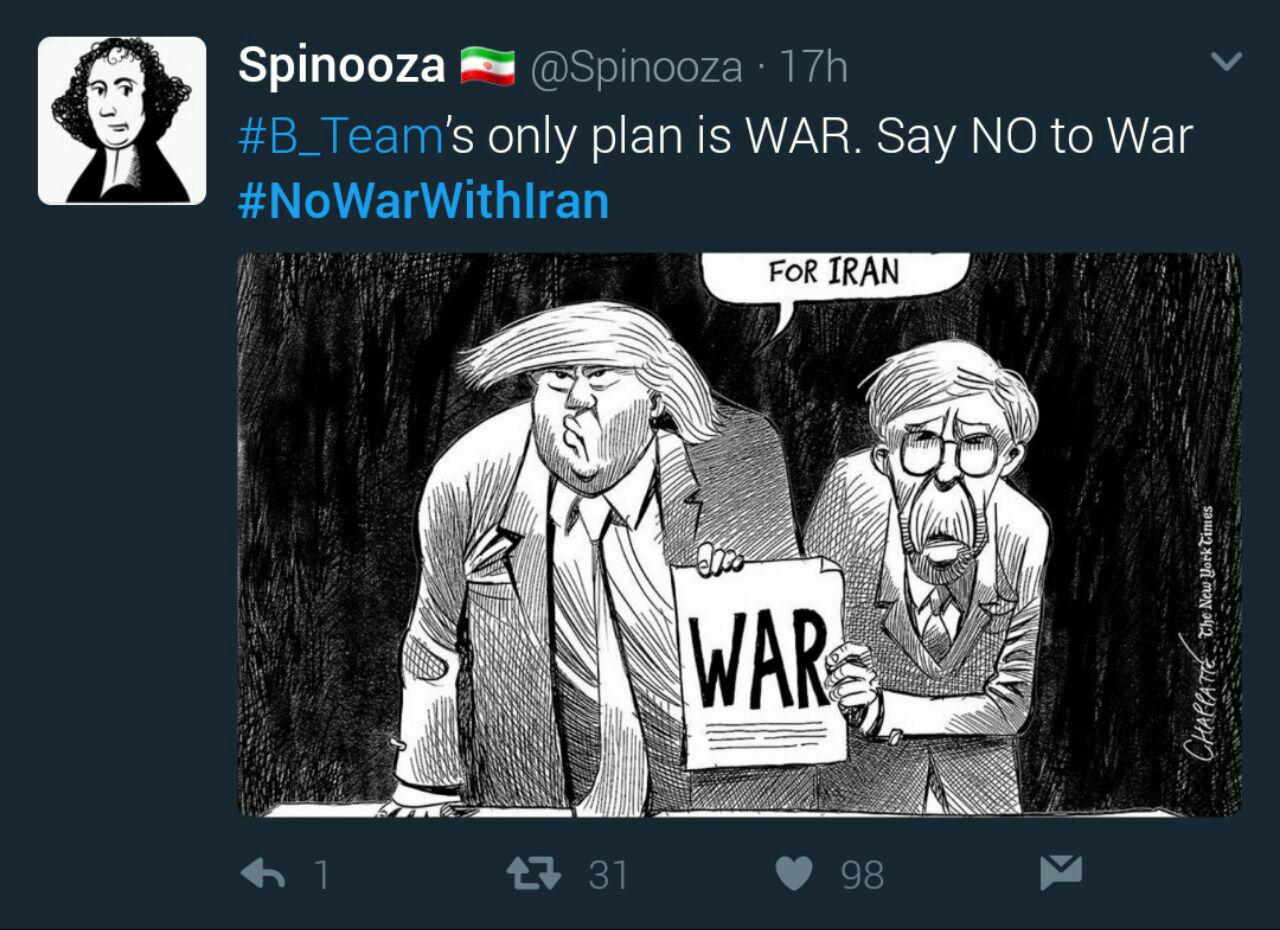 کاربری دیگر با نام اسپینوزا ضمن انتشار کاریکاتور بولتون و ترامپ نوشت: تنها نقشه و طرح تیم ب(بولتون، بنیامین نتانیاهو و بن سلمان) جنگ است. به جنگ نه بگویید.