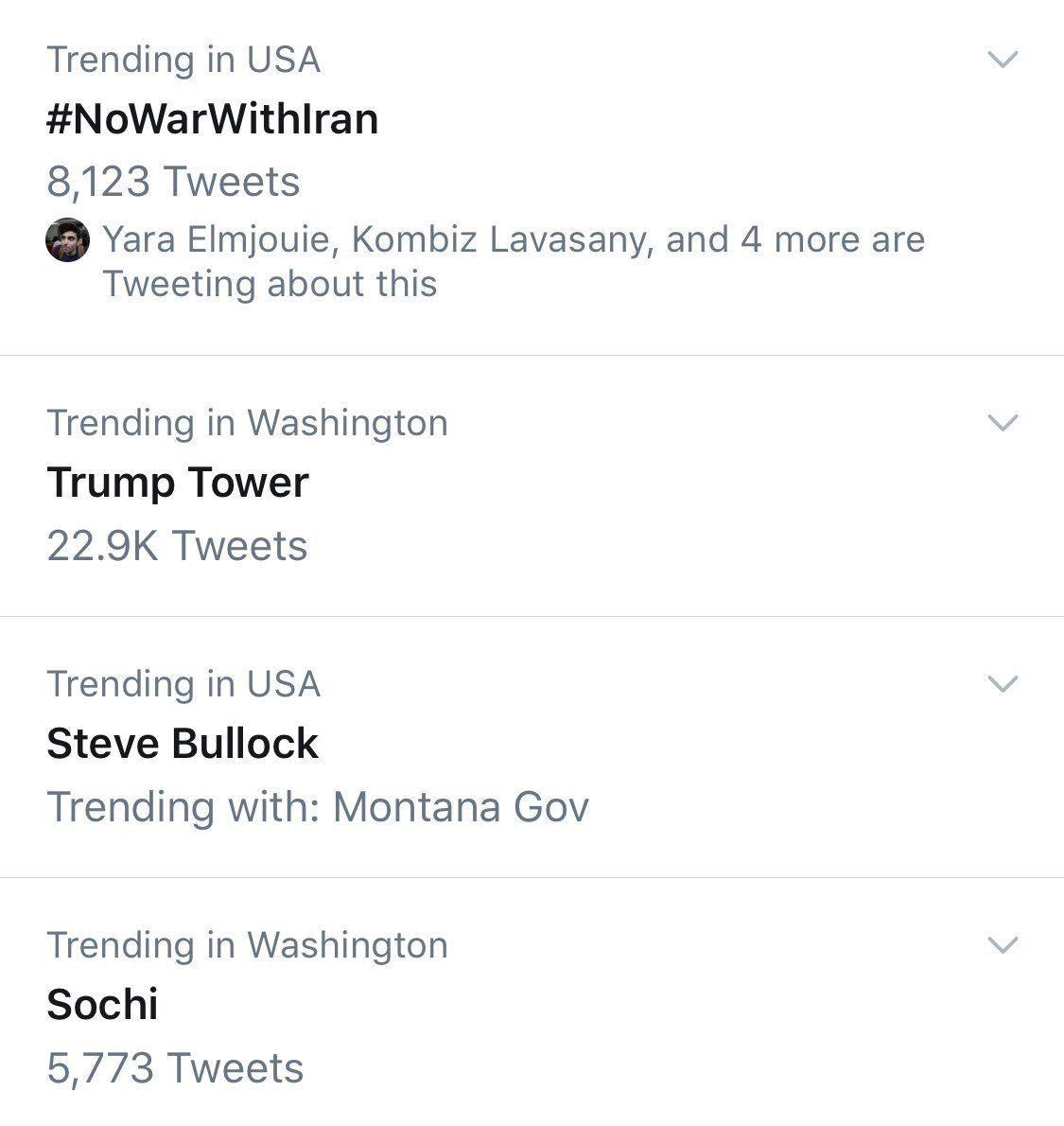 حالا هشتگ «نه به جنگ با ایران» در آمریکا ترند شده و افراد و گروههای مختلفی از جمله برنی سندرز كانديداي دموكرات انتخابات ٢٠٢٠ دربارهاش توییت كردهاند.