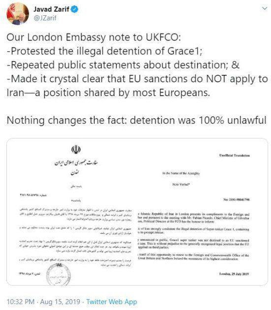او ضمن انتشار تصاویر دو نامه در صفحه توییترش نوشت: سفارت ما در لندن به اطلاع وزارت امور خارجه بریتانیا رساند که: