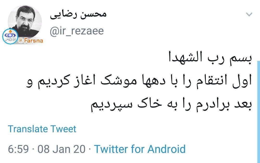 محسن رضایی در حساب شخصی خود در توییتر نوشت: