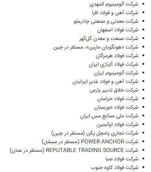 وزارت خزانه داری آمریکا که پیش از این شرکت فولاد مبارکه (بزرگترین تولیدکننده فولاد در ایران) را تحریم کرده بود، در بیانیه جدید خود ضمن اشاره مجدد به نام این شرکت، از تحریم شرکت‌های دیگری شامل فولاد صبا، فولاد هرمزگان، فولاد اصفهان، فولاد کاوه جنوب، فولاد آلیاژی ایران، شرکت صنعتی و معدنی گل‌گهر، شرکت صنعتی و معدنی چادرملو، آهن و فولاد ارفع، شرکت آلومینیوم ایران، شرکت آلومینیوم المهدی، شرکت ملی مس ایران، فولاد خوزستان و شرکت آهن و فولاد غدیر خبر داد.