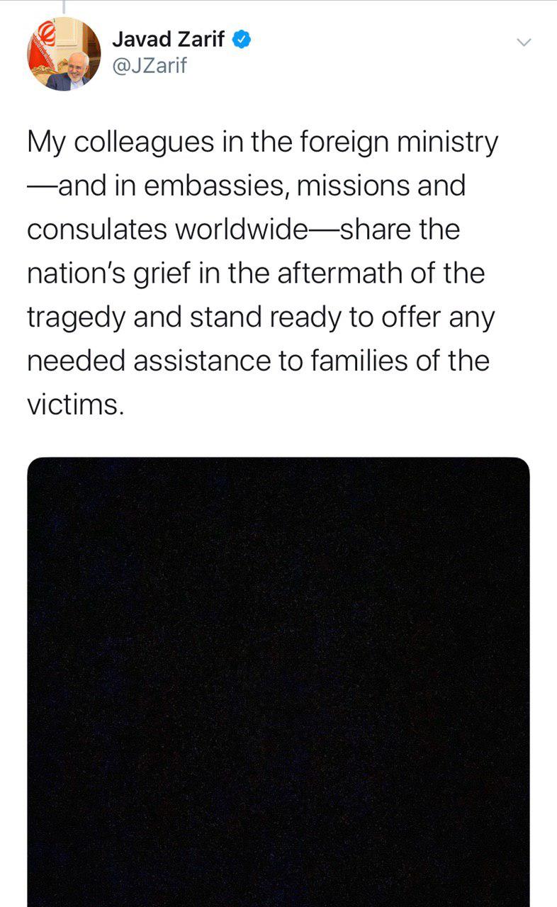 محمد جواد ظریف وزیر امورخارجه در توییتی نوشت: همکاران من در وزارت امور خارجه - و سفارتخانه‌ها، نمایندگی‌ها و کنسولگری‌ها در سرتاسر جهان - در غم مردم پس از این تراژدی شریک هستند و آماده‌اند تا هر کمک مورد نیاز خانواده‌های قربانیان را ارائه کنند.