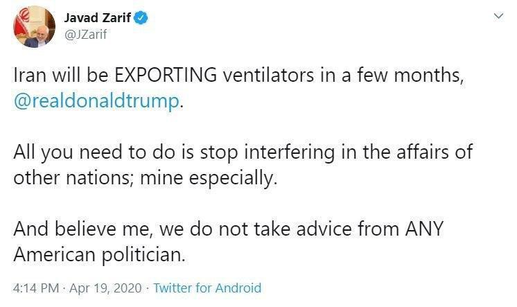 محمدجواد ظریف وزیر امور خارجه کشورمان در واکنش به اظهارات اخیر دونالد ترامپ، رئیس جمهور آمریکا درباره کمک به مردم ایران و خطاب به او در صفحه توییترش نوشت: ایران ظرف چند ماه قادر به صادر کردن ونتیلاتور(دستگاه تنفس مصنوعی) خواهد بود. تمام کاری که باید انجام دهی این است که مداخله در امور کشورهای دیگر و به ویژه کشور من را متوقف کنی.