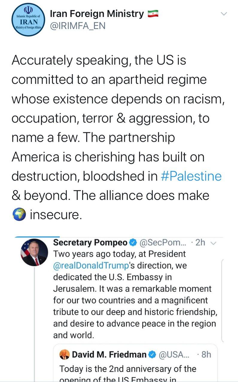 در توییت وزارت امورخارجه آمده است: به بیانی دقیقتر، آمریکا متعهد به رژیم آپارتایدی است که موجودیت آن وابسته به نژادپرستی، اشغالگری، ترور و تهاجم و خیلی موارد دیگر است. شراکتی که آمریکا آن را محترم میشمارد، بر ویرانی و کشتار در فلسطین و فراتر از آن بنا شده است. این ائتلاف جهان را به مراتب ناامن کرده است.