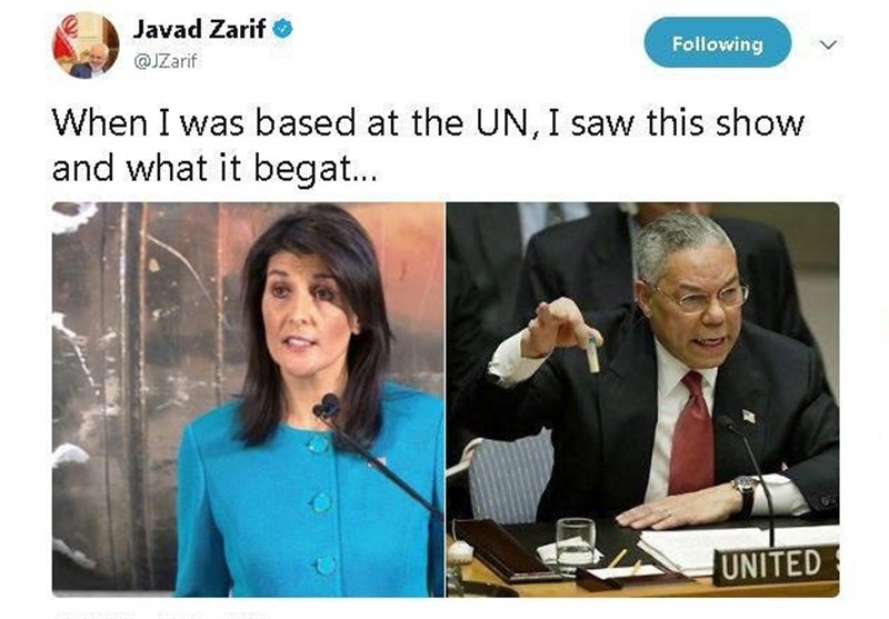 وزیر خارجه کشورمان به نمایش تبلیغاتی نماینده آمریکا در سازمان ملل واکنش نشان داد.
