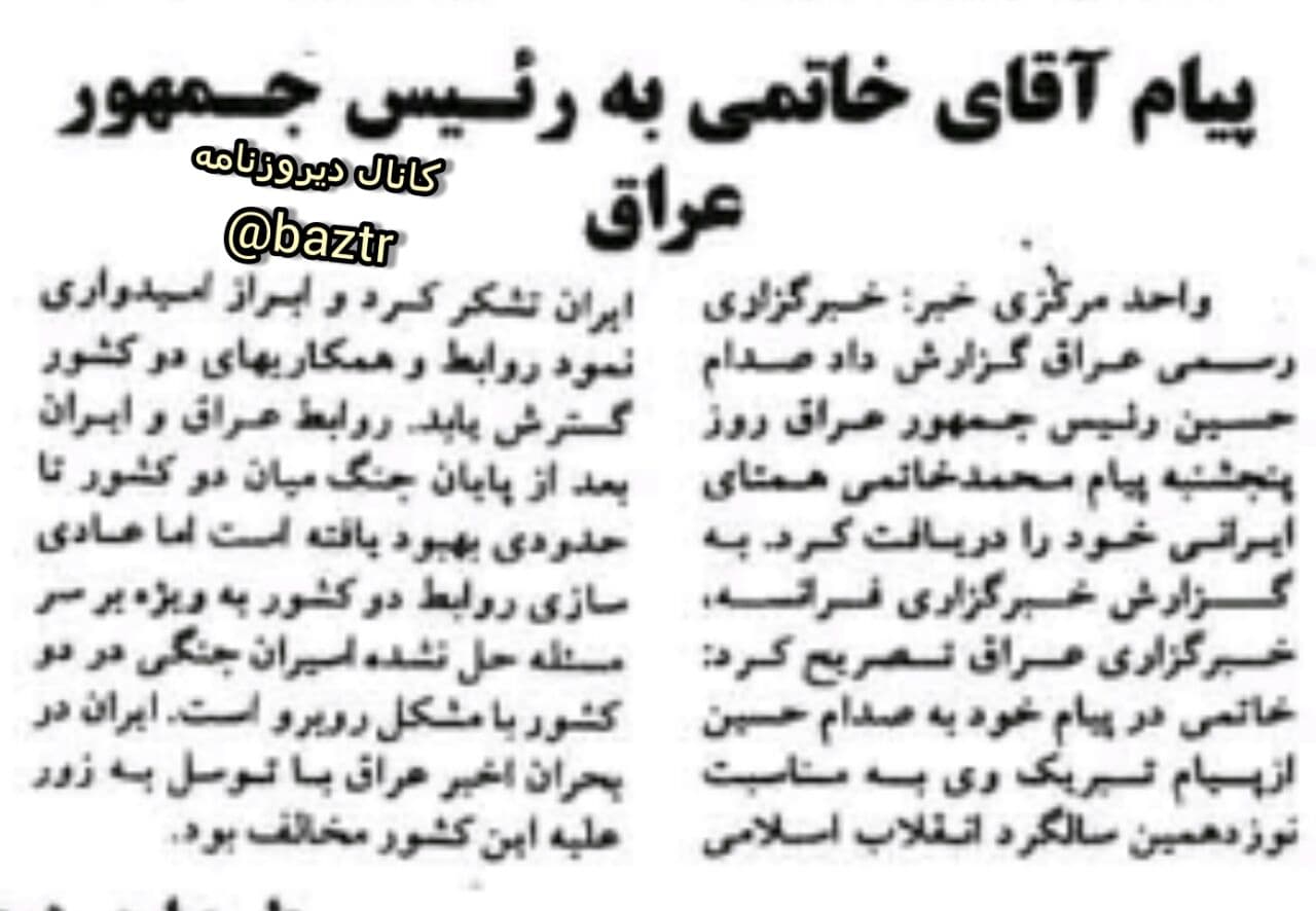 پیام رییس دولت اصلاحات به رییس جمهور عراق در روزنامه جمهوری اسلامی مورخ ۹ اسفند ۱۳۷۶ منتشر شد.