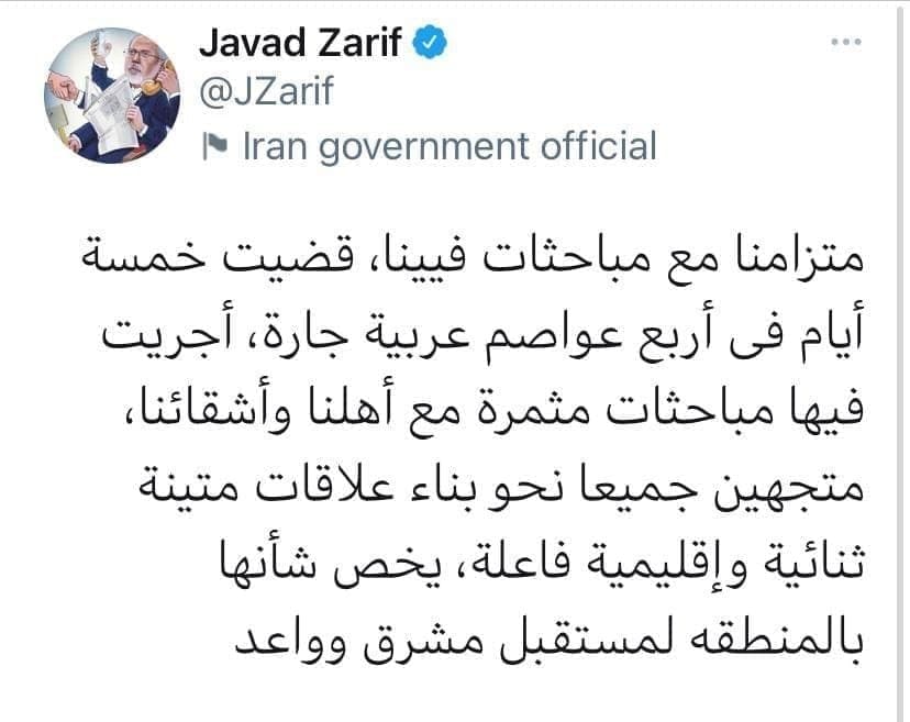 وزیر خارجه ایران در صفحه شخصی خود در توئیتر به زبان عربی نوشت: همزمان با مذاکرات وین، در سفری پنج روزه به چهار کشور عربی همسایه رایزنیهای مفیدی را با برادرانمان انجام دادم.