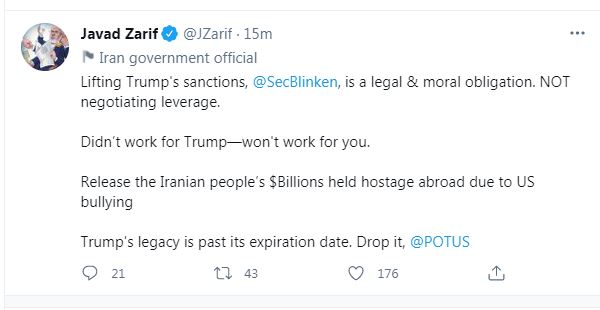 رئیس دستگاه دیپلماسی ایران در واکنش به این اظهارات بلینکن در پیامی که در صفحه توییتر خود منتشر کرد، گفت: «آنتونی بلینکن، لغو تحریمهای (دوران) ترامپ یک وظیفه قانونی است و یک اهرم مذاکره نیست».