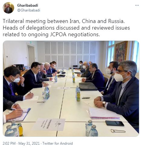 وی در این باره نوشت: روسای هیأت‌های ایران، روسیه و چین مسائل مرتبط با گفت‌وگوهای جاری برجام را مورد بحث و بررسی قرار دادند.