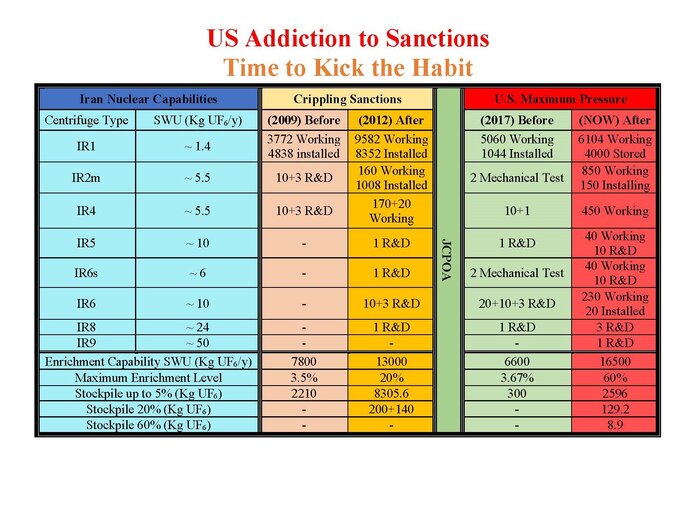 وزیر امور خارجه با اشاره به رویکردهای مختلف روسای جمهوری آمریکا علیه ایران اظهار کرد: اوباما دریافت که «تحریم‌های فلج‌کننده» او، ایران و سانتریفیوژهای ایران را فلج نمی‌کند. ترامپ ساده‌لوحانه تصور کرد که «فشار حداکثری» چنین خواهد کرد. هرگز چنین نخواهد شد.