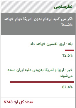 براساس یک نظرسنجی که سایت خبر فوری منتشر کرده، 5/87درصد شرکت کنندگان در این نظرسنجی گفتهاند که امیدی به آینده برجام بدون آمریکا ندارند چون بهنظر آنها قرار نیست اروپا تضمین خاصی به ایران بدهد.
