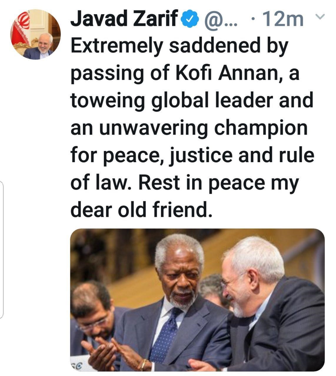 ظریف در پیامی توئیتری با ابراز تاسف عمیق از درگذشت دوست دیرینه خود " کوفی عنان " دبیرکل اسبق سازمان ملل متحد، از وی به عنوان رهبری بی نظیر و قهرمان صلح، عدالت و حاکمیت قانون یاد کرد.
