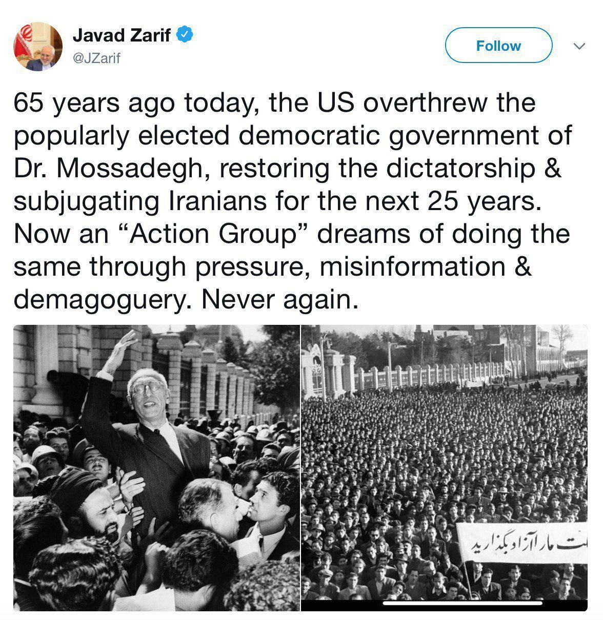 ظریف ، وزیر امور خارجه در سالگرد کودتای ۲۸ مرداد در توییتی نوشت: ▫️۶۵ سال قبل در چنین روزی، آمریکا دولت منتخب مردمی مرحوم دکتر مصدق را سرنگون و رژیم خودکامه را دوباره حاکم کرد و برای ۲۵ سال بعد مردم ایران را تحت استیلای خویش قرار داد. اکنون نیز «گروه اقدام» آن کشور از طریق فشار، دروغ پردازی و عوامفریبی آرزوی تکرار همان سناریو را در سر میپروراند. دوباره هرگز!
