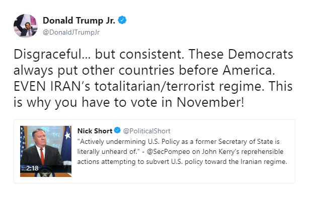 وی ضمن بازنشر بخشهایی از اظهارات مایک پومپئو وزیر خارجه آمریکا که اقدام کری در مذاکره با مقامات ایران را در جهت تضعیف سیاست خارجی آمریکا خوانده بود مدعی شد: « خفت بار، اما همیشگی است. دموکراتها همواره کشورهای دیگر حتی نظام حامی تروریسم ایران را به آمریکا ترجیح میدهند. به همین دلیل است که شما باید در ماه نوامبر در انتخابات شرکت کنید.»