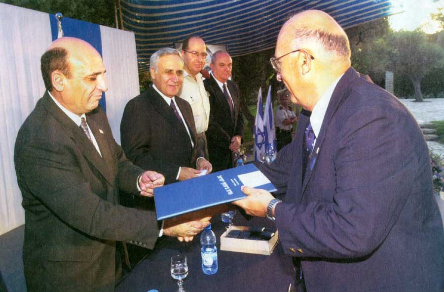 یوزی رابین در حال دریافت "جایزه دفاعی اسرائیل" از دست شائول موفاز وزیر جنگ اسبق رژیم صهیونیستی در سال 2003