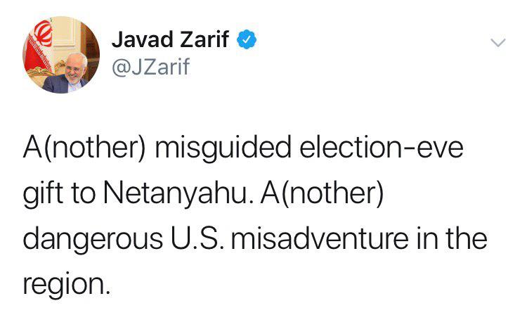 تحلیل ظریف از اقدام خصمانه آمریکا علیه سپاه پاسداران انقلاب اسلامی ایران: هدیه انتخاباتی به نتانیاهو و اشتباه خطرناک دیگر در منطقه