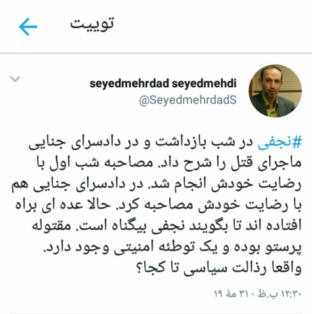 رئیس خبرگزاری صداوسیما در صفحه توییترش نوشت: مصاحبه نجفی با رضایت خودش انجام شد.