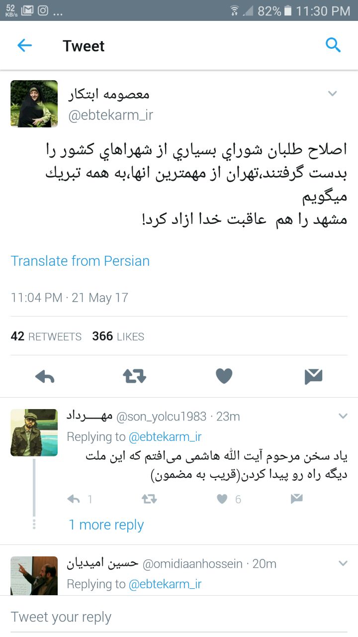 ابتکار در توییت خود به انتخابات شورای شهر مشهد نیز کنایه ای زد و مشهد را به اسیری تشبیه کرد که گویا با حضور اصلاح طلبان آزاد شده است.