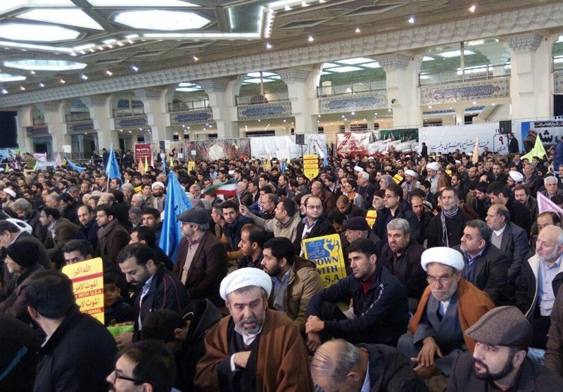 حاضرین در این مراسم پلاکاردهایی با مضامین محکومیت فتنه گران نیز در دست دارند و شعارهای ضد آمریکایی سر میدهند.