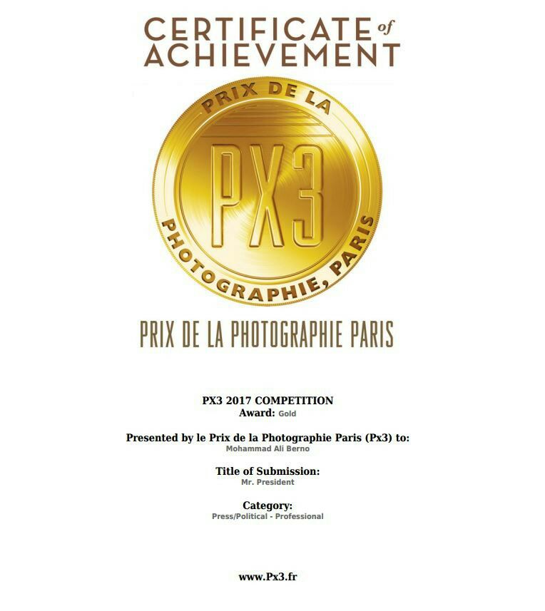 محمد برنو، عکاس رییس جمهوری در جشنواره عکس px3 پاریس با دو مجموعه از عکس های حسن روحانی هم مدال طلا گرفت و هم لوح تقدیر.