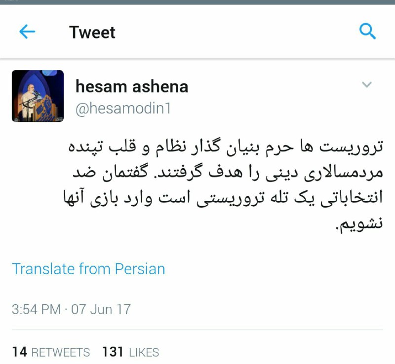 حسام الدین آشنا مشاور رسانه ای رییس جمهوری هم در صفحه توییترش نوشت: