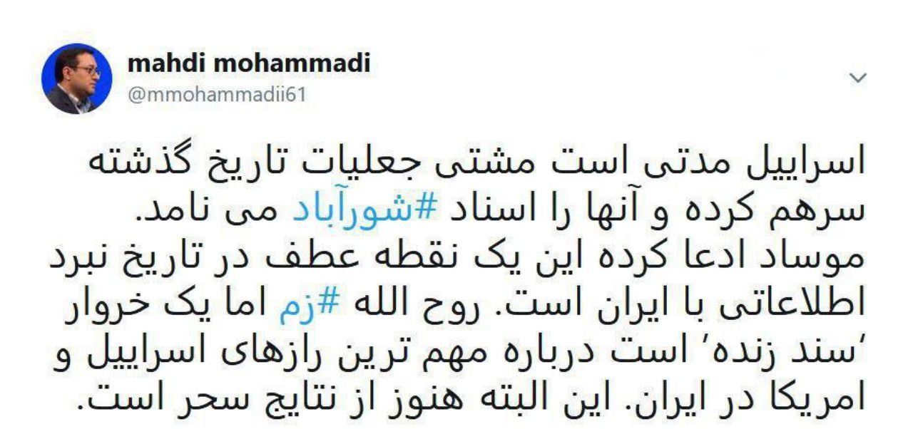 مهدی محمدی، تحلیلگر سیاسی در مورد روح الله زم تویبت کرد: زم یک خروار سند زنده است... این البته هنوز از نتایج سحر است.