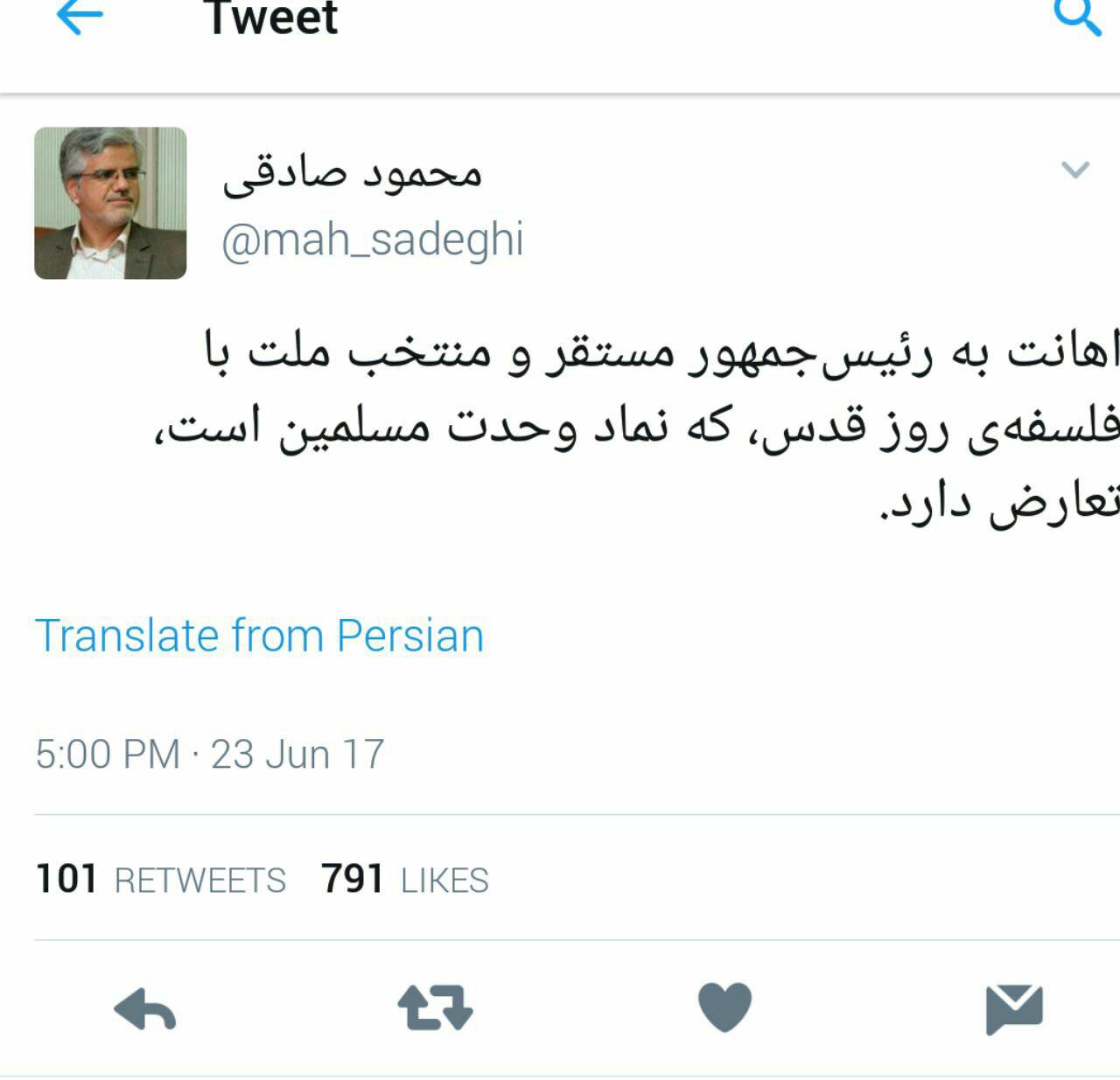 محمود صادقی سیاستمدار اصلاح طلب و نماینده مردم تهران ، ری، شمیرانات، اسلامشهر و پردیس در توییتر خود نوشت: اهانت به رئیس جمهور منتخب ملت با فلسفه روز قدس ، که نماد وحدت مسلمین است تعارض دارد.