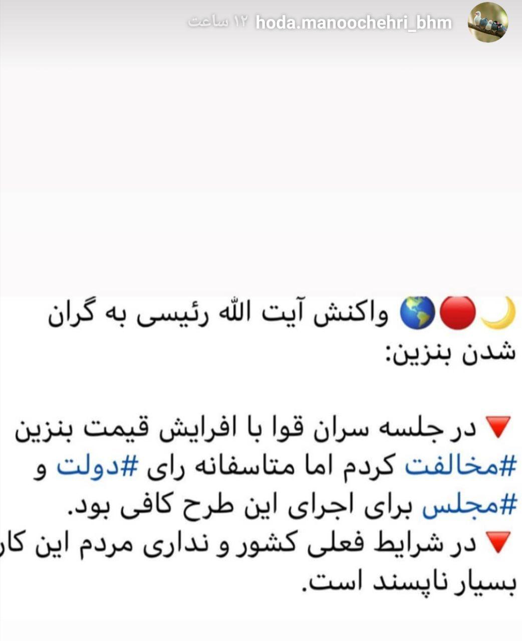سلام ... با توجه به اعتراضات منطقه ای در بغداد و بیروت گران کردن بنزین در این مقطع زمانی که توسط شخص ریس جمهور صورت گرفته جای تامل زیاد دارد . اکثر نمایندگان مجلس و کارشناسان قویا تصدیق میکنند گران کردن بنزین در مقطع کنونی بصلاح کشور نبوده و نیست . اهمیت موضوع از آنجاست که ایران با رهنمودهای رهبری عزیز در حال عبور پیروزمندانه از فشارهای تحمیلی دولت آمریکا میباشد درست در آخرین مرحله و نزدیک به این پیروزی بزرگ و تاریخی چنین اقدامی از جانب دولت آقای روحانی حیرت انگیز است !