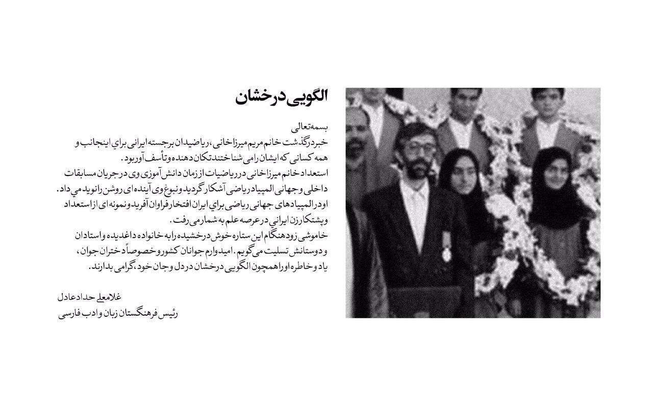 غلامعلی حداد عادل در پیام تسلیتی به مناسبت درگذشت مریم میرزاخانی، دانشمند و نابغه ریاضی، عکسی را منتشر کرده که بخشهای از این عکس را حذف کرده است. در این عکس مریم میرزاخانی در کنار آیت الله هاشمی رفسنجانی و محمدعلی نجفی، مشاور رییس جمهور و وزیر آموزش و پرورش دوران سازندگی ایستاده است. با این حال، حداد عادل تصویر آیت الله هاشمی و محمدعلی نجفی را حذف کرده است.