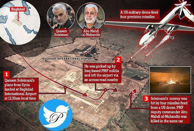 سپهبد سلیمانی و هیئت همراه سوار بر خودرو شده و به سمت بغداد رفتند. ۴ فروند موشک از سوی پهپاد آمریکایی به سوی دو خودرو شلیک شد و سپهبد سلیمانی و المهندس در یک خودرو کنار هم به شهادت رسیدند.