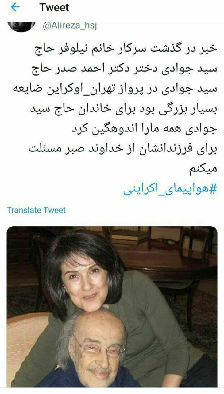 نیلوفر دختر احمد صدرحاج سیدجوادی (وزیر دولت موقت بازرگان) نیز در هواپیمای اوکراین بود و در سقوط آن جان باخت.
