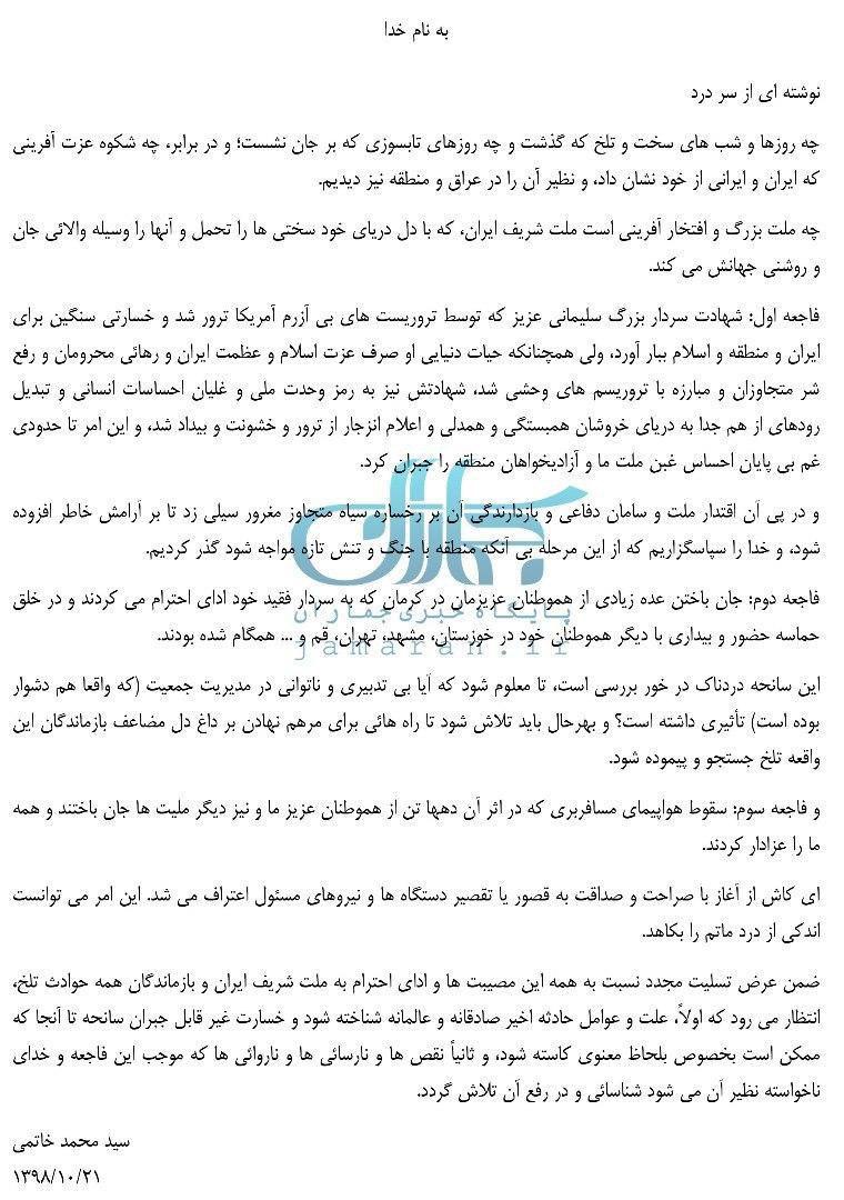 یادداشت سید محمد خاتمی درباره وقایع اخیر؛ شهادت سردار سلیمانی به رمز وحدت ملی تبدیل شد